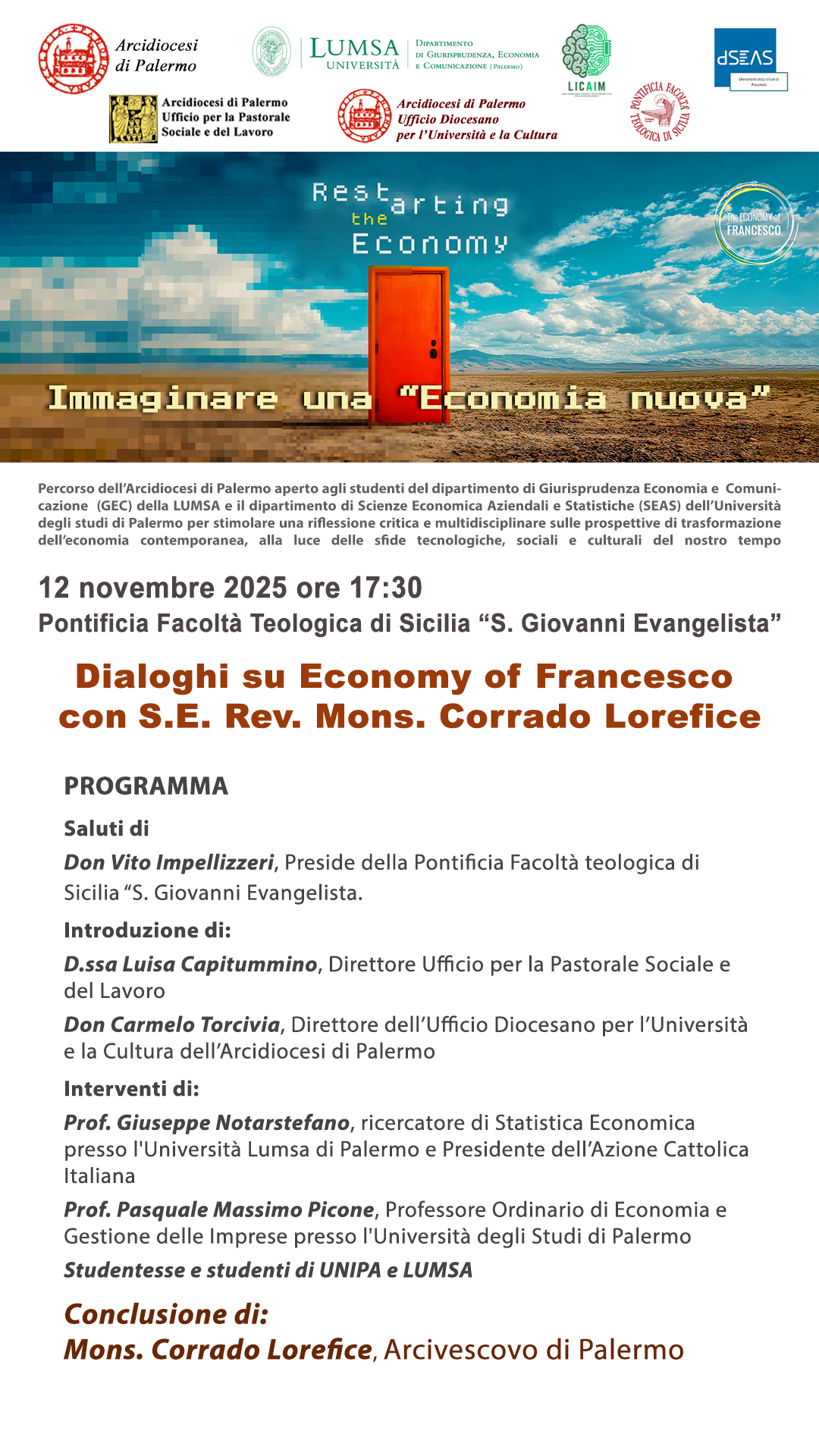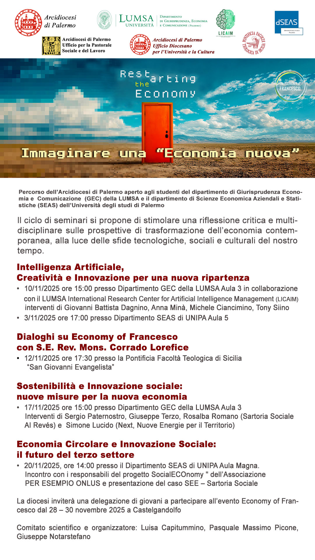 Il ciclo dei seminari è aperto agli studenti del dipartimento di Giurisprudenza Economia e Comunicazione (GEC) della LUMSA e il dipartimento di Scienze Economica Aziendali e Statistiche (SEAS) dell’Università degli studi di Palermo e si inserisce nel contesto delle iniziative dell’evento “RESTARTING THE ECONOMY” promosso dal Movimento “the econoy of Francesco”.